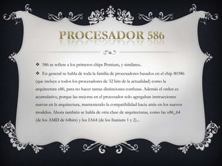 El documento describe la evolución de los procesadores Intel desde el 486 hasta el Core i3. El Intel 486 introdujo mejoras de rendimiento respecto al 386 como un conjunto de instrucciones optimizado y caché integrada. Los Pentium introdujeron nuevas instrucciones y aumentaron las velocidades de reloj. Los procesadores dual core como el Core 2 Duo y el Pentium Dual-Core integraron dos núcleos para mejorar el rendimiento multihilo. El Core i3 continuó esta tendencia de integrar múltiples núcleos.