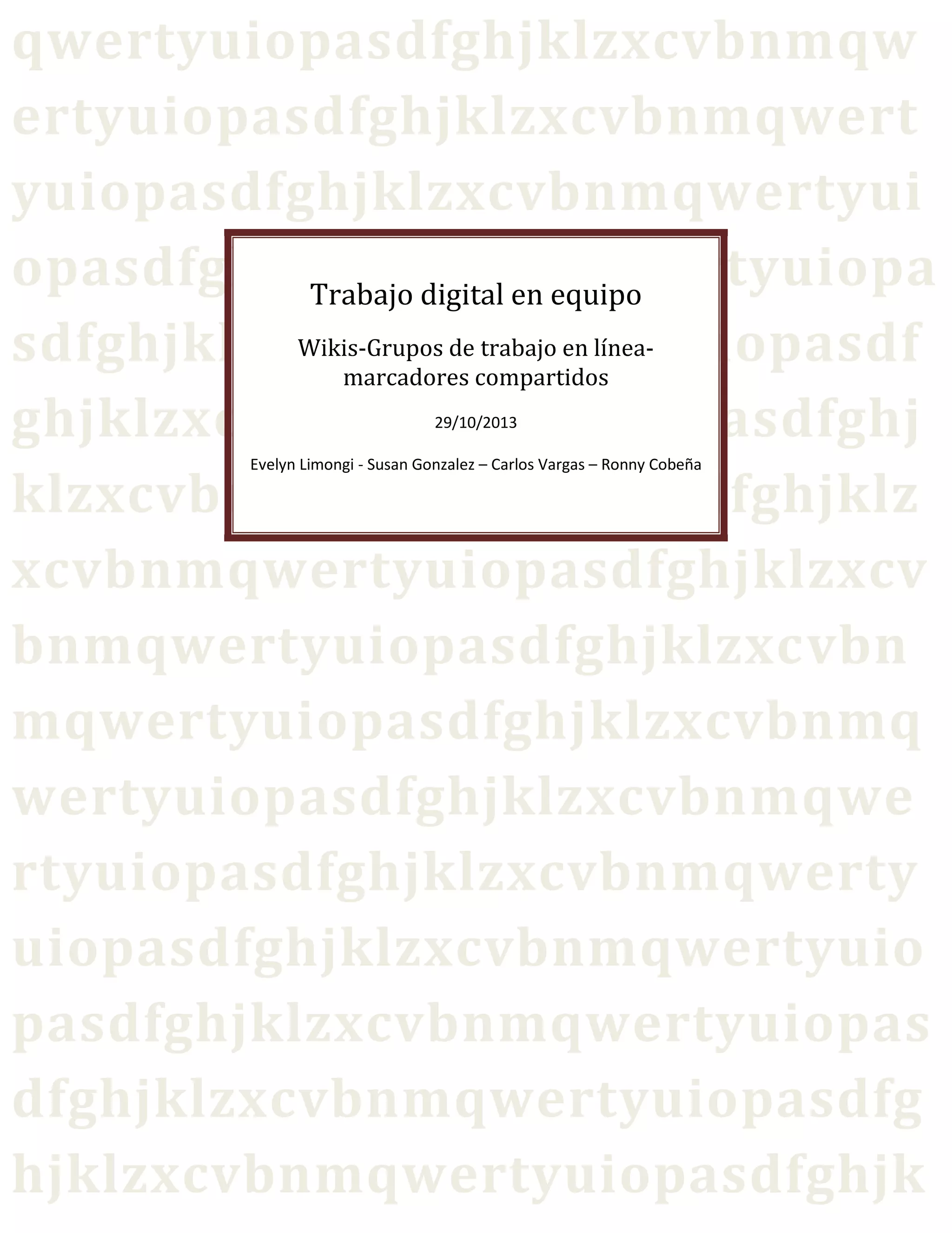 Este documento describe diferentes herramientas para el trabajo digital en equipo como wikis, marcadores compartidos y grupos de trabajo en línea. Explica que los wikis permiten la colaboración pública en la creación y edición de contenido web de forma colaborativa. Los marcadores compartidos permiten almacenar, clasificar y compartir enlaces de internet de forma colaborativa. Los grupos de trabajo en línea son espacios virtuales que permiten a los equipos colaborar de forma asincrónica en documentos y proyectos compartidos.