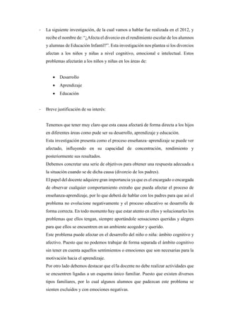 Este documento resume una investigación sobre cómo el divorcio de los padres puede afectar el rendimiento escolar de los niños en educación infantil. El divorcio puede afectar el desarrollo cognitivo, emocional e intelectual de los niños, así como su capacidad de aprendizaje, concentración y rendimiento. Los maestros desempeñan un papel importante al observar cualquier comportamiento inusual y hablar con los padres para abordar los problemas y asegurar que el proceso educativo progrese correctamente.