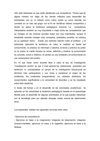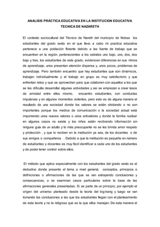 El documento describe el contexto sociocultural y las características de los estudiantes de sexto grado en la Institución Educativa Técnica de Nazareth. Los estudiantes provienen de estratos socioeconómicos bajos y muestran diferentes ritmos de aprendizaje, algunos con problemas de atención y aprendizaje. El autor aplica el método deductivo y otros métodos para desarrollar actividades que involucren a los estudiantes. Realiza investigación-acción para mejorar los contenidos y métodos educativos. Aplica la