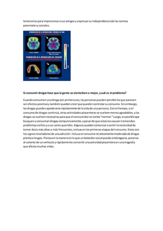 La adicción a las drogas es una enfermedad crónica del cerebro caracterizada por el consumo compulsivo de drogas a pesar de sus consecuencias dañinas. Muchos factores aumentan el riesgo de adicción, incluyendo factores genéticos, ambientales como el entorno familiar y la edad temprana de consumo, así como el método de administración de las drogas. La adicción generalmente comienza en la niñez o adolescencia y afecta el desarrollo del cerebro.