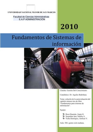 El documento presenta las respuestas a preguntas sobre clasificación y tipos de sistemas de información. Explica que los sistemas se pueden clasificar por nivel organizacional, función, cobertura y criterios. Describe los principales sistemas de nivel operacional, gerencial, estratégico y de conocimiento, e ilustra cada uno con características y ejemplos. Finalmente, enumera cuatro tipos de sistemas según su cobertura y da un ejemplo para cada uno.