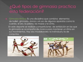 Este documento resume diferentes disciplinas de gimnasia como la rítmica, en trampolín, acrobática y artística. Detalla algunas de sus características y modalidades. También menciona algunas penalizaciones comunes y proporciona información básica sobre la historia y organización de la gimnasia.