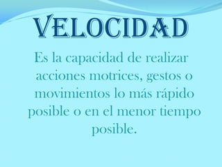 Este documento describe diferentes tipos de velocidad importantes para el baloncesto como la velocidad de reacción, simple, compleja y de desplazamiento. Luego detalla ejercicios de velocidad como palmeo contra el tablero, tiros en suspensión, drible con cambio de dirección y drible controlado. Finalmente, explica las capacidades físicas básicas para el baloncesto como la resistencia, fuerza, velocidad, flexibilidad, coordinación y equilibrio.