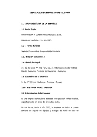 La empresa Contratista y Consultores Mendoza S.R.L. se dedica a la ejecución de obras civiles en Perú desde 2003. Inició prestando servicios de alquiler de equipos y mano de obra subcontratada, y desde 2008 participa directamente en licitaciones públicas de obras viales. Actualmente ejecuta proyectos en varios departamentos peruanos y planea incrementar sus ventas anuales de S/ 15 millones a S/ 25 millones. La empresa propone reestructurar su organización para captar obras más grandes mediante