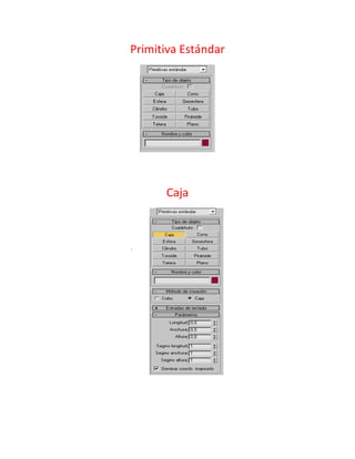 Este documento presenta instrucciones para crear diferentes figuras geométricas 3D como cubos, esferas y cilindros en un programa de modelado 3D. Explica cómo construir estas figuras básicas usando las herramientas de segmentación, rotación y escalado. También identifica las herramientas para mover y personalizar los objetos según los gustos del usuario.