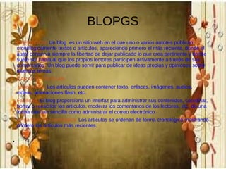 El documento define un blog, describe sus características como la organización cronológica de artículos y la capacidad de incluir diferentes medios. Explica que los blogs pueden ser personales, profesionales o corporativos. También menciona proveedores populares como Blogger, Facebook y Twitter, y destaca usos educativos y profesionales de los blogs.