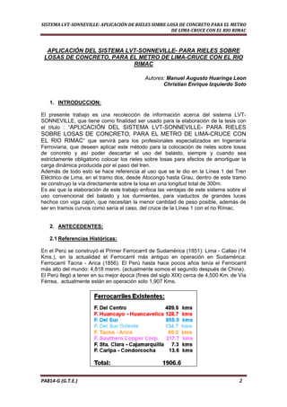 Este documento describe el sistema LVT-Sonneville para la colocación de rieles sobre losas de concreto como una alternativa al uso tradicional de balasto y durmientes de madera. Se explica que este sistema fue utilizado con éxito en 300 metros de la Línea 1 del Metro de Lima para cruzar el Río Rímac. Adicionalmente, se proporcionan antecedentes históricos sobre ferrocarriles en el Perú y se compara el sistema LVT-Sonneville con métodos tradicionales.