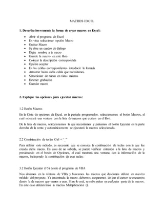 El documento describe cómo crear y utilizar macros en Excel. Explica que las macros son conjuntos de instrucciones que se ejecutan secuencialmente y que se pueden crear en Excel usando código Visual Basic. Detalla los pasos para grabar, ejecutar y eliminar macros, así como para asignar macros a botones.