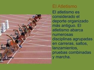 El documento presenta una introducción al atletismo, describiendo su origen histórico y las diferentes disciplinas que lo componen, incluyendo carreras, saltos y lanzamientos. Luego se enfoca en explicar las diferentes categorías de carreras en atletismo, dividiéndolas en velocidad, vallas, media distancia, larga distancia, relevos y marcha, detallando las distancias y reglas específicas de cada una.