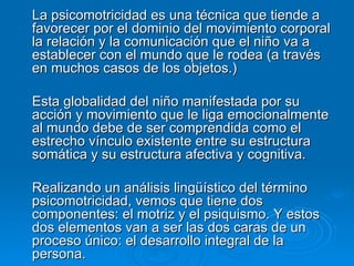 El documento presenta un resumen del concepto y desarrollo de la psicomotricidad en niños de 0 a 6 años. Explica que la psicomotricidad busca favorecer la relación del niño con el mundo a través del dominio del movimiento corporal. Describe las etapas del desarrollo psicomotor desde el nacimiento hasta los 6 años, incluyendo hitos motrices como gatear, caminar y correr. También presenta los objetivos y contenidos de la psicomotricidad.
