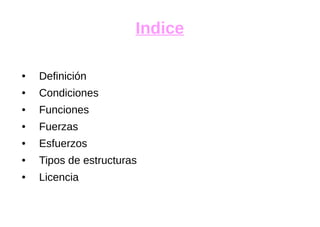 Este documento define estructuras y describe sus funciones principales como soportar peso y fuerzas externas. Explica que hay dos tipos de fuerzas: externas como viento y terremotos, e internas resultado de procesos internos de la corteza terrestre. Además, clasifica las estructuras en naturales como árboles, y artificiales construidas por humanos como edificios. Estas pueden ser masivas, abovedadas, entramadas, trianguladas, colgantes, neumáticas o laminares.