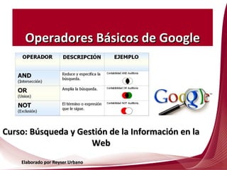 Este documento describe los operadores básicos de Google que permiten realizar búsquedas más específicas. Explica cómo usar comillas para buscar frases exactas, el signo menos para excluir palabras, y el rango de tiempo (2015..2016) para limitar los resultados a un período. También cubre cómo buscar definiciones, archivos de un tipo particular mediante "filetype:", sitios específicos con "site:", y usar "OR" para buscar términos alternativos.
