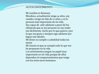 Rosmary Mendoza tiene 41 años, está casada y tiene un hijo de 12 años. Su deseo es cumplir todas sus metas en la vida y aprovechar cada momento para mejorar intelectual, personal y profesionalmente. Su visión es proyectarse como una exitosa empresaria. Estudia en la Universidad de Cartagena para tener mejores ingresos y capacidad de liderazgo.