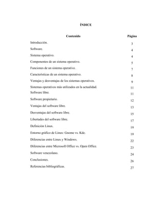 Este documento presenta una introducción al concepto de software y sistema operativo. Define software como el conjunto de instrucciones que controlan la operación de un sistema computacional. Explica que un sistema operativo es el programa más importante de una computadora que realiza tareas básicas como administrar recursos, entrada/salida, memoria y archivos. Además, describe los componentes principales de un sistema operativo, sus funciones, características, ventajas y desventajas de sistemas operativos populares como Linux, Windows y Macintosh.