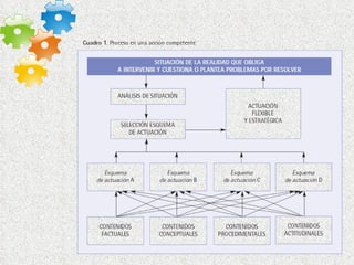 El documento describe las competencias básicas y sus implicaciones en la educación. 1) Define las competencias básicas como conocimientos, capacidades y actitudes necesarias para la integración laboral y social. 2) Señala ocho competencias básicas, incluyendo comunicación, matemáticas, tratamiento de información, aprendizaje autónomo, e iniciativa personal. 3) Explica que las competencias básicas deben integrarse en el currículo y evaluarse de forma continua para apoyar el aprendizaje.