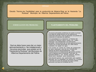 El documento presenta un estudio de factibilidad para la producción de mojarra roja en la Hacienda La Ruidosa en Villarrica, Tolima. El estudio busca determinar la viabilidad técnica, económica y ambiental del proyecto. Se analizan variables como oferta y demanda, condiciones de producción, comercialización y rentabilidad. El objetivo es dar un mejor uso a los recursos piscícolas existentes mediante la implementación de procesos productivos más eficientes.