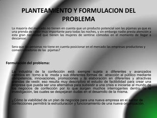 Este documento presenta un proyecto para crear una empresa productora y comercializadora de pijamas para damas, analizando su factibilidad económica y técnica. Se justifica la necesidad en el mercado, se describen los objetivos, el marco conceptual y contextual, y se analiza la demanda, oferta y proceso productivo. El proyecto propone la producción de pijamas de alta calidad en la localidad de Engativa, Bogotá.