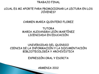 Este documento presenta un trabajo final sobre cómo promover la lectura entre los jóvenes. El documento destaca que la lectura es fundamental para el éxito académico y el desarrollo de habilidades en la era digital. Propone varias estrategias para motivar a los jóvenes a leer, como la lectura guiada, compartida e independiente. Concluye que aunque la tecnología ha avanzado, la lectura sigue siendo básica y que tanto escuelas como padres deben fomentar buenos hábitos de lectura desde una ed