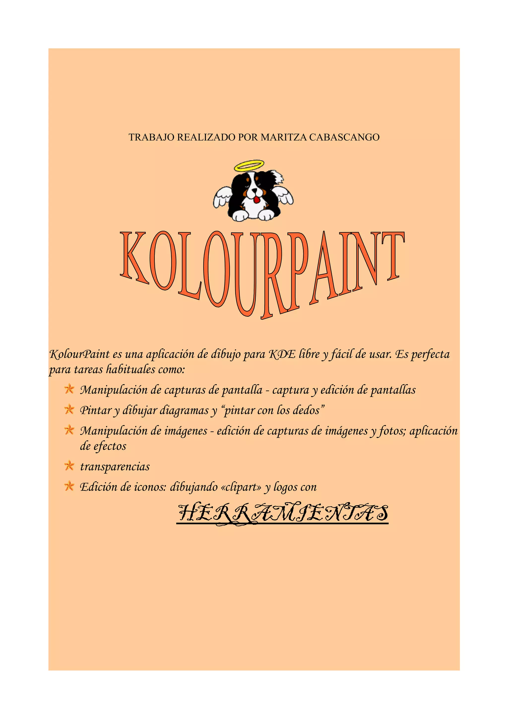 KolourPaint es una aplicación de dibujo libre y fácil de usar para KDE. Proporciona herramientas para dibujar, editar imágenes y aplicar efectos como manipulación de capturas de pantalla, pintura, edición de iconos y más. Incluye herramientas como brocha, selección de color, líneas, curvas, elipses, borradores y relleno para crear y modificar imágenes. Explica cómo usar cada herramienta y proporciona ejemplos de su uso.