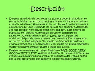 El documento describe un proyecto final para un curso de inglés en el que los estudiantes trabajarán en grupos para crear una historia utilizando vocabulario y estructuras gramaticales aprendidas recientemente, la cual publicarán en formato multimedia. Los estudiantes también participarán en intercambios de idiomas semanales y serán evaluados en varias categorías. La profesora reflexiona que las redes sociales pueden ser una herramienta útil para la enseñanza más allá de su uso casual, y que desea continuar aprendiendo sobre su aplicación educ
