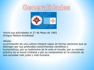 El documento presenta información sobre la Universidad Católica Santa María la Antigua. Menciona su misión de formar personas con conocimientos científicos y humanísticos comprometidas con una sociedad justa. También describe objetivos como elevar la calidad de la investigación y desarrollo e implementar nuevas tecnologías para mejorar los servicios a la comunidad universitaria.