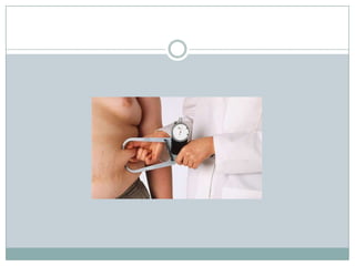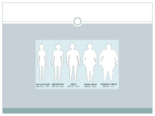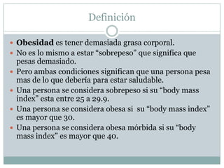 Este documento define la obesidad y discute sus causas y factores de riesgo. Explica que la obesidad significa tener demasiada grasa corporal y se define utilizando el índice de masa corporal. Algunas causas incluyen comer en exceso, falta de ejercicio, problemas médicos y factores genéticos. También analiza la prevalencia creciente de la obesidad en los Estados Unidos.