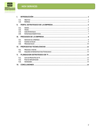 Este documento presenta propuestas tecnológicas para mejorar los procesos de la empresa Imágenes Digitales. Describe la empresa, su misión, visión y estrategias. Explica los principales procesos de la empresa como la adquisición de proyectos, producción, entrega y ventas. También analiza la cadena de valor e identifica los procesos clave como la asignación de personal, capacitación, y creación de paquetes de imágenes. Finalmente, propone mejoras a procesos específicos y un esquema de infraestruct
