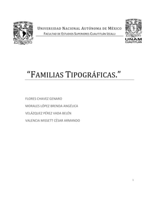 El documento describe las familias tipográficas y sus clasificaciones. Explica que una familia tipográfica es un grupo de signos escriturales que comparten rasgos de diseño comunes. También describe los elementos de identificación de las tipografías como la altura, ascendentes, astas, serifas y más. Finalmente, resume las principales clasificaciones de familias tipográficas según autores como Vox, Thibaudeau y Bringhurst.