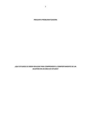Para comprender el comportamiento de un acuífero en un área de estudio se deben realizar los siguientes estudios: (1) estudios geológicos para definir las formaciones presentes, los límites del acuífero y su volumen; (2) estudios hidrogeológicos para obtener datos sobre la ocurrencia del agua subterránea, niveles freáticos, espesores de materiales y parámetros hidráulicos; (3) estudios de balance hídrico para determinar la disponibilidad actual de agua en la z