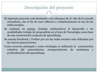 Este proyecto busca enseñar a los estudiantes de tercer año a usar las redes sociales de manera responsable y como herramienta de aprendizaje. Los estudiantes usarán Facebook y Twitter para completar actividades colaborativas centradas en la construcción de identidades digitales seguras. El proyecto durará tres semanas e incluirá debates, encuestas e investigaciones sobre el uso apropiado de las redes sociales.