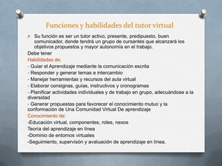 El documento describe las funciones y habilidades requeridas de un tutor virtual efectivo. Un tutor virtual debe guiar el aprendizaje a través de la comunicación escrita, responder preguntas, planificar actividades individuales y de grupo, y generar una comunidad de aprendizaje virtual. Las funciones principales de un tutor incluyen funciones académicas, psicosociales y organizativas para apoyar las necesidades de los estudiantes y ayudarlos a lograr los objetivos del curso.