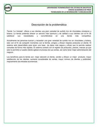 Este documento describe los requisitos funcionales y no funcionales para un sistema de administración de una tienda de chocolates y botanas. El sistema permitirá registrar productos, clientes y usuarios, consultar y modificar esta información, y generar reportes de ventas. Se incluyen diagramas que muestran las interacciones entre la vista, controlador y modelo para cada uno de los requisitos funcionales principales como acceso, registro y consulta.