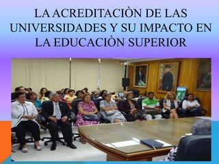 Este documento trata sobre el proceso de acreditación universitaria y su impacto en la educación superior. Explica las etapas del proceso de evaluación, incluyendo la autoevaluación, la evaluación externa y la acreditación. También describe las funciones del Consejo Nacional de Evaluación y Acreditación Universitaria de Panamá y la importancia del proceso de autoevaluación institucional.