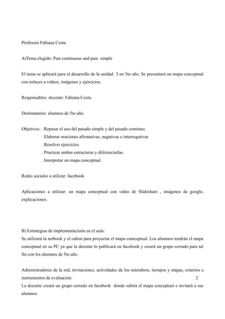 Este documento describe un proyecto de enseñanza sobre el uso del pasado simple y continuo en inglés para alumnos de 5to año. La profesora utilizará un mapa conceptual en Facebook como recurso educativo. El mapa incluirá videos, imágenes y ejercicios. La profesora evaluará a los estudiantes en función de su participación en clase y la resolución de actividades.