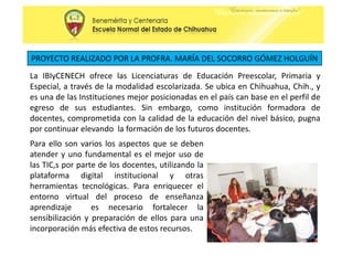 El documento describe el ambiente actual de aprendizaje de la IBIyCENECH, una institución formadora de docentes en Chihuahua. Actualmente, los docentes utilizan principalmente recursos digitales como texto e internet para la información, y los estudiantes realizan resúmenes de la información. Se propone enriquecer el entorno virtual incorporando más herramientas tecnológicas para mejorar la interacción, producción y exhibición de contenidos.