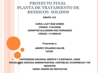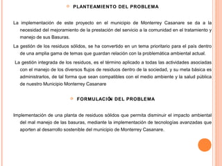 Este proyecto propone la implementación de una planta de tratamiento de residuos sólidos en el municipio de Monterrey Casanare, con el objetivo de mejorar la gestión de basuras y fomentar el desarrollo sostenible. El proyecto busca disponer de una planta de acopio para el reciclaje y aprovechamiento de los residuos sólidos a través de la obtención de componentes reciclables, gestión de la materia orgánica y envío adecuado de residuos peligrosos. De implementarse, el proyecto benefic