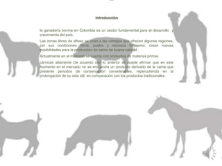 El documento describe las fortalezas y debilidades de los cortes de carne en una región de Colombia. Identifica que la región tiene un gran potencial para producir carne bovina de alta calidad debido a sus condiciones de suelo, clima y recursos forrajeros. Sin embargo, el mercado informal de carne representa casi el 80% de la producción y existe falta de conocimiento tecnológico para mejorar el manejo de las carnes.