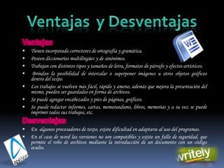 Este documento describe los procesadores de texto. Un procesador de texto es un software para crear documentos de texto que puede incluir formatos, imágenes y otros objetos. Los procesadores de texto permiten formato de texto, alineación, sangría y estilos. Ofrecen ventajas como correctores ortográficos pero también desventajas como falta de compatibilidad entre versiones. Existen opciones de software libre, comercial y en línea.