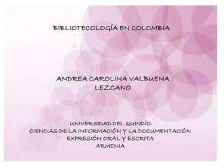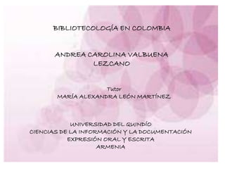 Este documento resume la bibliotecología en Colombia. Explica que la bibliotecología es una carrera importante que ha evolucionado en el país. Detalla los requisitos para ser bibliotecólogo, incluyendo obtener un título universitario en bibliotecología y matrícula profesional a través del Consejo Nacional de Bibliotecología. Además, explica que las bibliotecas públicas en Colombia, como la Biblioteca Nacional y la Biblioteca Luis Ángel Arango, son parte fundamental de la Red de Bibliotecas Públicas para garantizar el ac