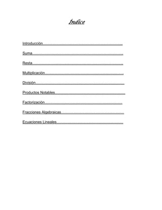 Este documento presenta un resumen de los temas de álgebra vistos en clase, incluyendo suma, resta, multiplicación, división, productos notables, factorización, fracciones algebraicas y ecuaciones lineales. Explica conceptos como términos algebraicos, expresiones algebraicas y exponentes, y provee ejemplos para ilustrar cada operación y concepto cubierto.