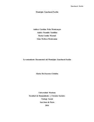 El documento presenta un levantamiento documental del municipio de Guachucal en Nariño, Colombia. Incluye información sobre la historia, aspectos geográficos, demográficos, económicos, educativos y de salud del municipio. Además, describe la metodología utilizada para realizar encuestas a funcionarios y la comunidad con el fin de identificar problemas y establecer un plan de acción.