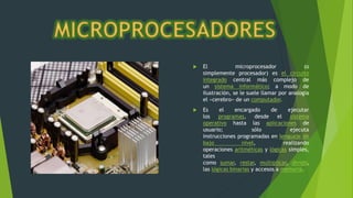 Este documento resume la historia de los principales microprocesadores desde 1971 hasta 1994. Comienza con el Intel 4004, el primer microprocesador del mundo en 1971, y continúa describiendo procesadores clave lanzados por Intel, Motorola, Zilog, AMD y otros como el 8008, 8080, 6800, Z80, 8086, 80286, 80386, 80486, Pentium y PowerPC entre 1971 y 1994.