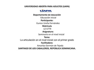 El documento trata sobre la articulación entre el nivel inicial y el primer grado. Explica que la articulación es el proceso de adaptación de los estudiantes entre niveles educativos. Justifica la importancia de una articulación efectiva para mejorar la calidad educativa y reducir problemas como la deserción y repetición. El propósito es establecer estrategias que faciliten la adquisición de aprendizajes entre niveles. Las causas de la falta de articulación incluyen debilidades en el nivel inicial y la necesidad de vincularlos. La conclusión