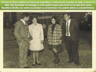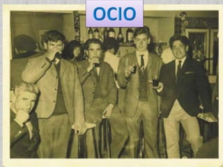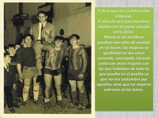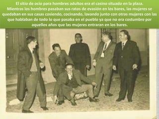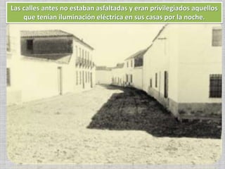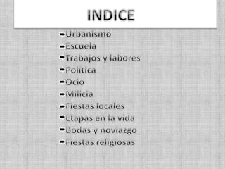 El documento describe aspectos de la vida cotidiana en el pueblo de Alcolea en décadas pasadas como los 40s, 50s y 60s. Habla sobre la falta de agua potable y la existencia de un pozo comunal, las labores agrícolas como la poda de olivos y la recolección de aceituna, las fiestas religiosas y tradiciones como bodas y primeras comuniones, y el servicio militar obligatorio para los jóvenes. También menciona oficios como herreros y panaderos, y formas de ocio como ir