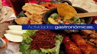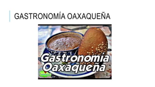 El documento describe la gastronomía de Oaxaca, México. Se destaca que los moles son uno de los principales platillos y que la cocina oaxaqueña fue declarada Patrimonio Cultural Inmaterial de la Humanidad por la UNESCO en 2010. También presenta una "Ruta del Mole" para promover el turismo gastronómico en la región y conocer los ingredientes y platillos típicos de Oaxaca como el mole, tamales de chepil y quesadillas de queso Oaxaca.