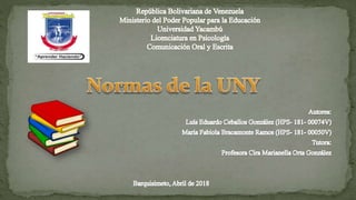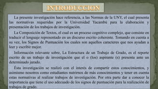 Este documento resume las normas de la Universidad Yacambú para la elaboración de trabajos de investigación. Explica que las normas establecen los requisitos y lineamientos metodológicos que deben seguir los estudiantes, incluyendo la estructura básica de un trabajo de grado con su introducción, marco teórico, metodología, resultados y conclusiones. También destaca la importancia de la composición de textos y el uso correcto de signos de puntuación para lograr una redacción clara y coherente.