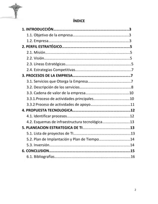 Este documento presenta una propuesta tecnológica para el consultorio médico de la Dra. Cristina Amezcua Moreno. Describe el objetivo y servicios de la empresa, así como su perfil estratégico que incluye la misión, visión y líneas estratégicas. También analiza los procesos, propone una infraestructura tecnológica, y presenta un plan de proyectos de TI, implementación e inversión para alinear la estrategia competitiva.
