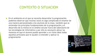 El documento describe una propuesta para mejorar la enseñanza de la programación avanzada en la Universidad Mariano Gálvez a través del uso de tecnología digital. La propuesta incluye el uso de un servidor para que los estudiantes puedan acceder a la pantalla del maestro y una pizarra digital para que los estudiantes puedan practicar y mostrar su trabajo. El objetivo es permitir que los estudiantes aprendan a su propio ritmo mientras el maestro los guía de manera interactiva a través de la tecnología.
