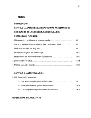 El documento es un ensayo sobre las experiencias académicas de una estudiante de la licenciatura en educación preescolar, analizando su observación en un jardín de niños. Se abordan temas como la interacción pedagógica, el uso de tecnología en la enseñanza y las actividades de aprendizaje de los niños. La autora también reflexiona sobre el desarrollo de competencias y desafíos en el ámbito educativo durante su segundo semestre de estudios.